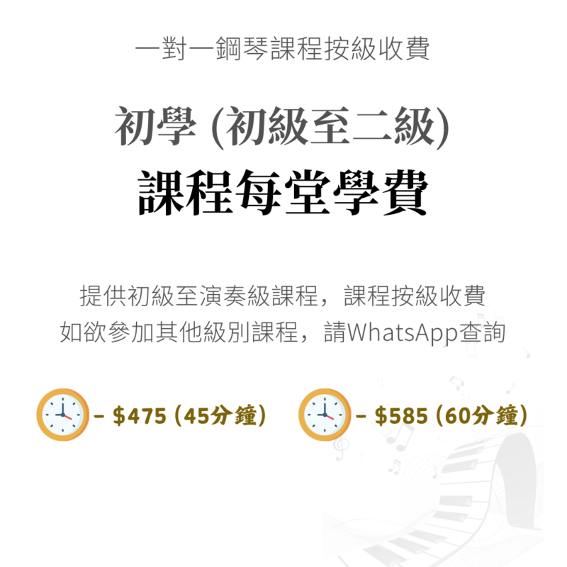 - 真實案例說話:30歲OL參加成人鋼琴初學課程,從零開始,兩年考獲5級Distinction;55歲退休人士重拾鋼琴,一年多彈出《卡農》。你也可以成為下一個成功故事。